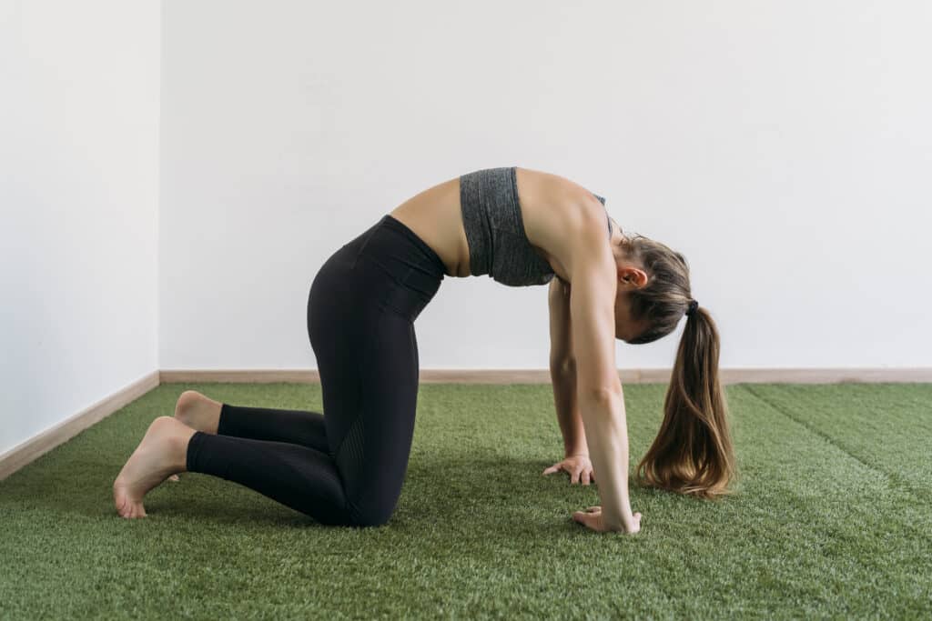 On hands and knees, gently arch your back toward the ceiling, then lower your belly toward the floor.