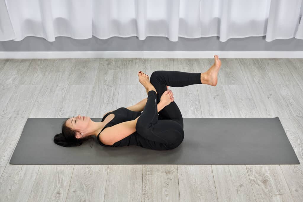 Use both hands to draw the knee across your body toward the opposite shoulder.